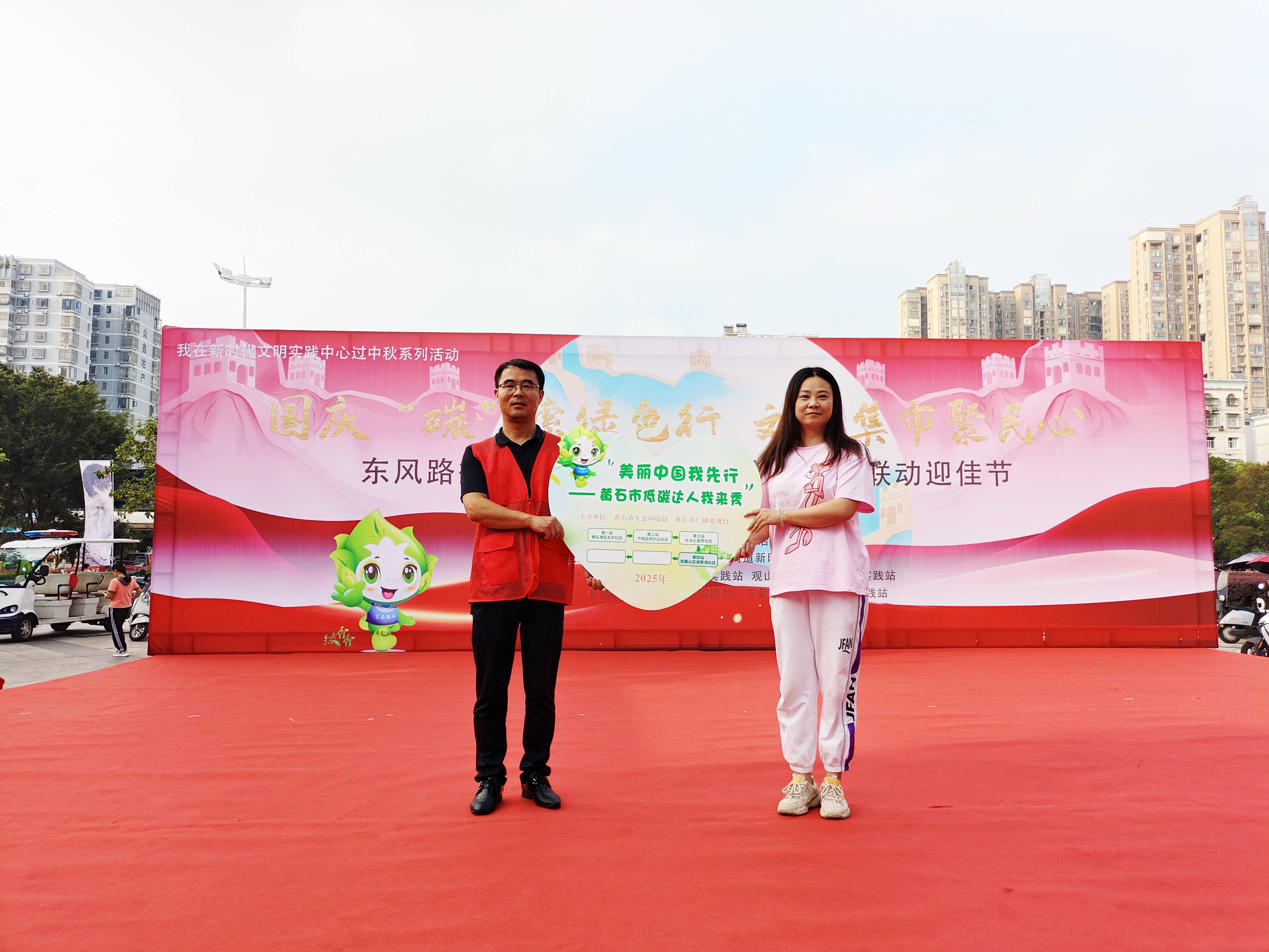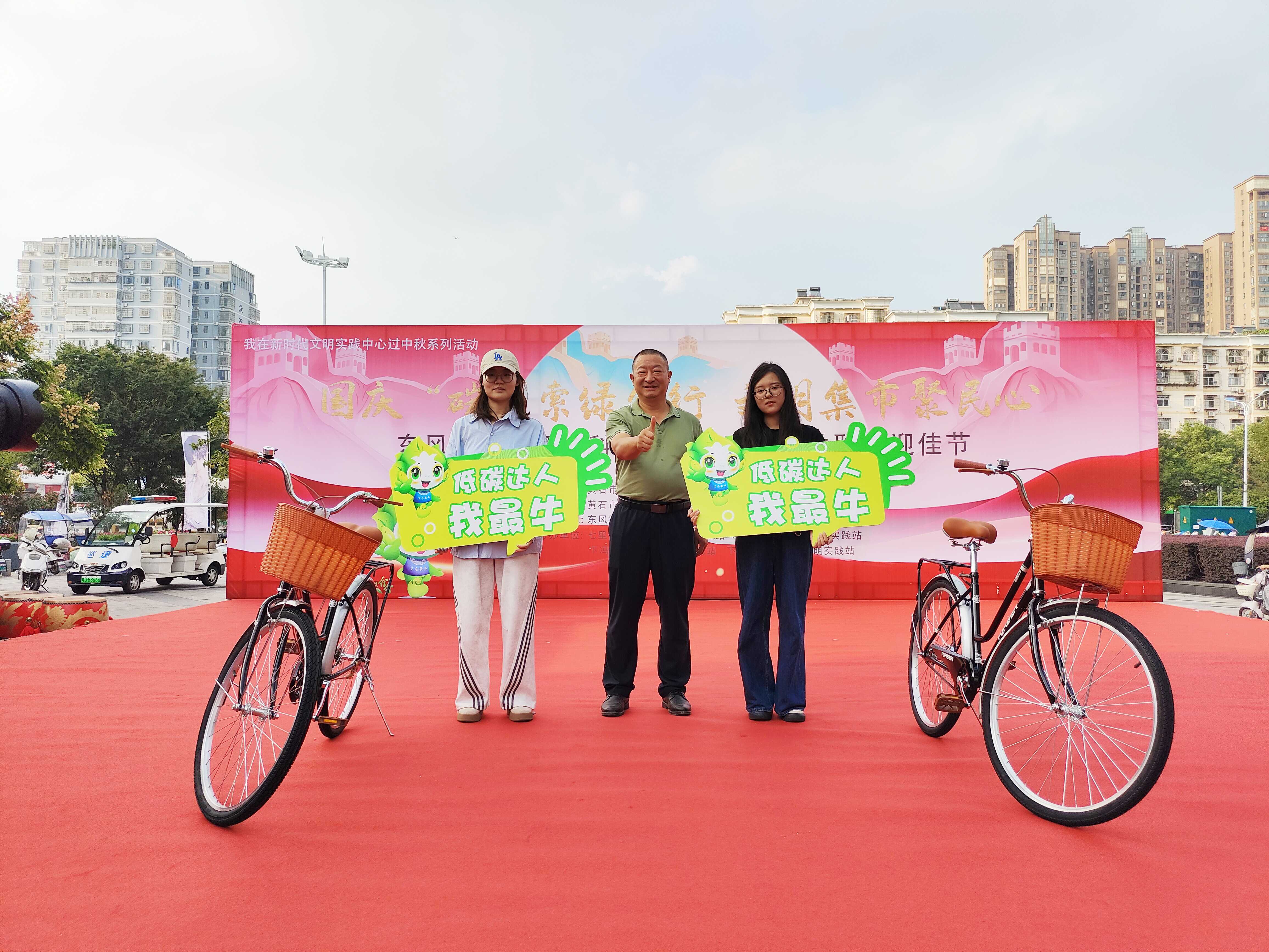 活动中,为七里界社区20位“低碳达人”发放公交卡奖励;黄石市生态环境局党组成员、副局长唐大平为2位“低碳牛人”获得者送上单车奖品,并鼓励大家以骑行的方式宣传绿色低碳理念,共同为减少碳排放、保护生态环境贡献力量。