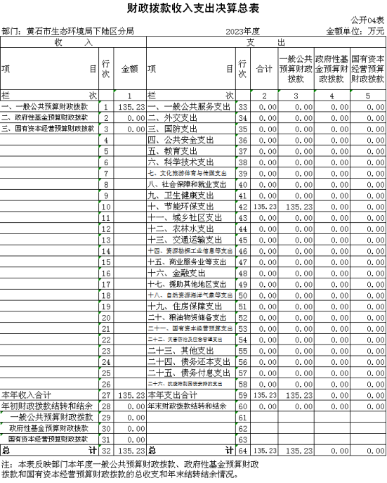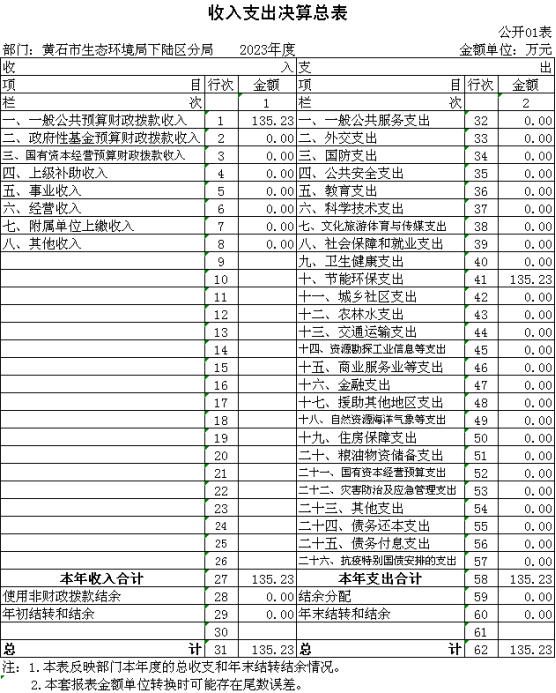 2023年度收、支总计均为135.23万元。与2022年度相比,收、支总计各增加21.83万元,增长19.2 %,主要原因是今年增加了省级生态环境保护以奖代补资金。