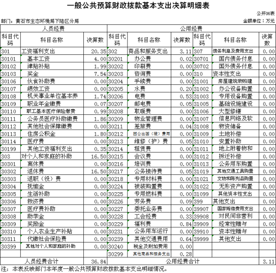 1.节能环保支出(类)环境保护管理事务(款)行政运行(项)。年初预算为36.83 万元,支出决算为39.95万元,完成年初预算的108.5%,支出决算数大于年初预算数的主要原因:是今年增加基础性绩效工资,对应人员经费增加。