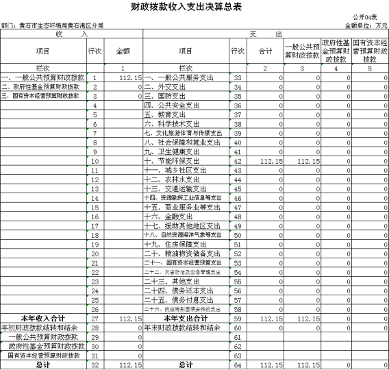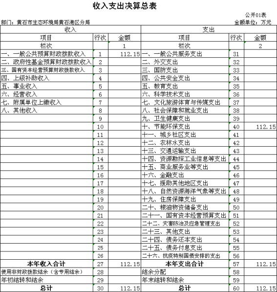 2024年度收、支总计均为112.15万元。与2023年度相比,收、支总计各减少27.81万元,下降19.9 %,主要原因:一是今年补发2023年度退休统筹绩效工资2.74万元,二是去年有省级生态环境保护以奖代补资金30万元。