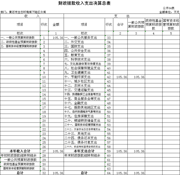 2024年度收、支总计均为105.36万元。与2023年度相比,收、支总计各减少29.87万元,下降22.1%,主要原因一是去年有省级生态环境保护以奖代补资金30万元及主要污染物总量减排专项经费7.4万元,二是今年补发退休人员统筹性绩效工资10.37万元。