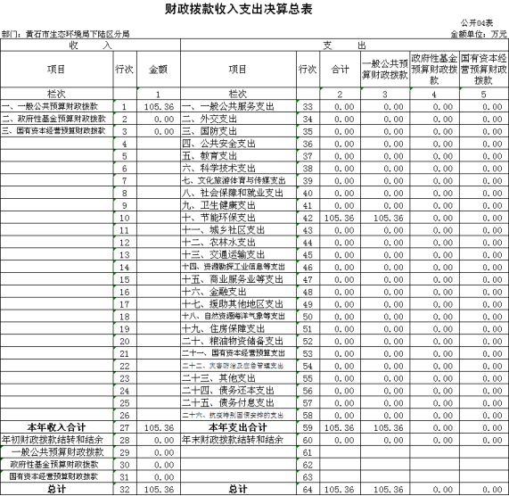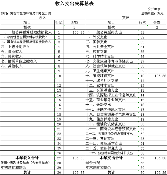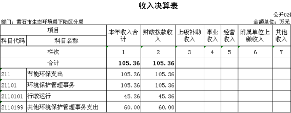 2024年度收、支总计均为105.36万元。与2023年度相比,收、支总计各减少29.87万元,下降22.1%,主要原因一是去年有省级生态环境保护以奖代补资金30万元及主要污染物总量减排专项经费7.4万元,二是今年补发退休人员统筹性绩效工资10.37万元。