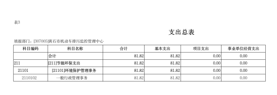 拨款支出(节能环保支出)81.82万元,占本年支出100%。按支出结构划分本年支出预算构成为:基本支出81.82万元,占总支出的100%;项目支出0万元,占总支出的0%。