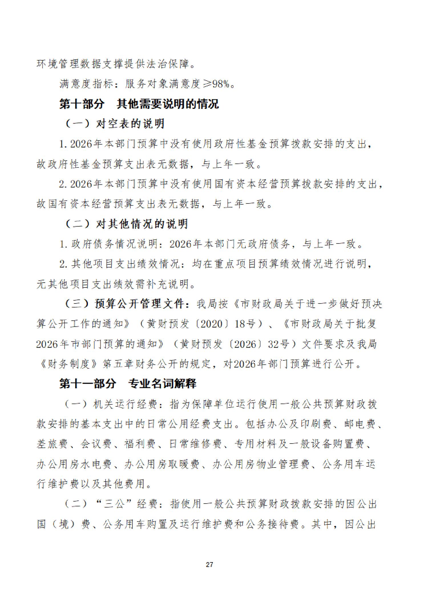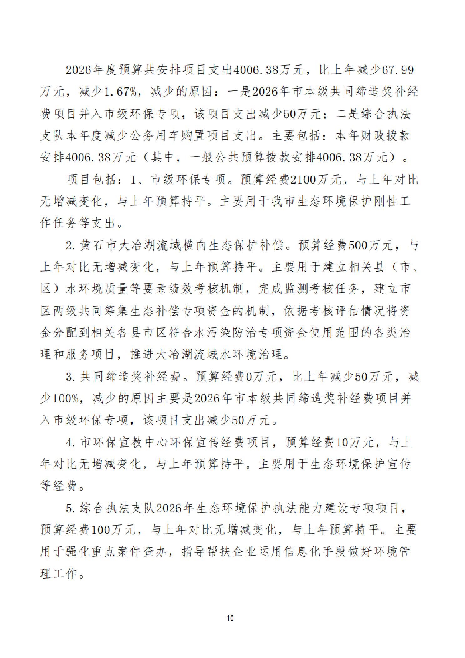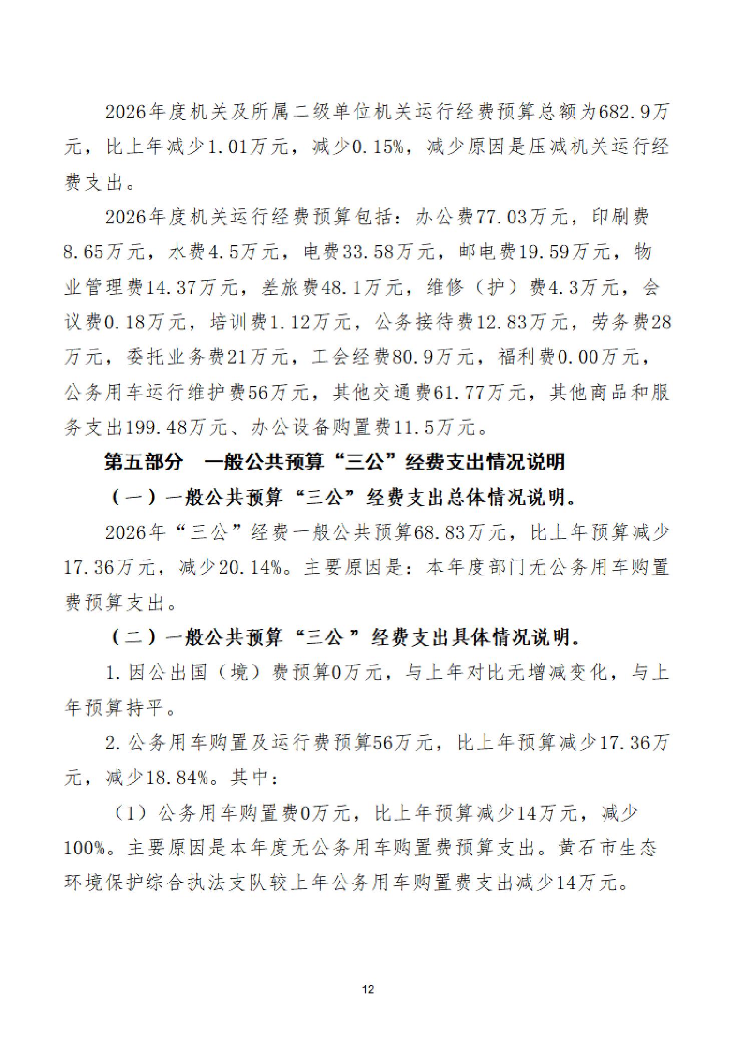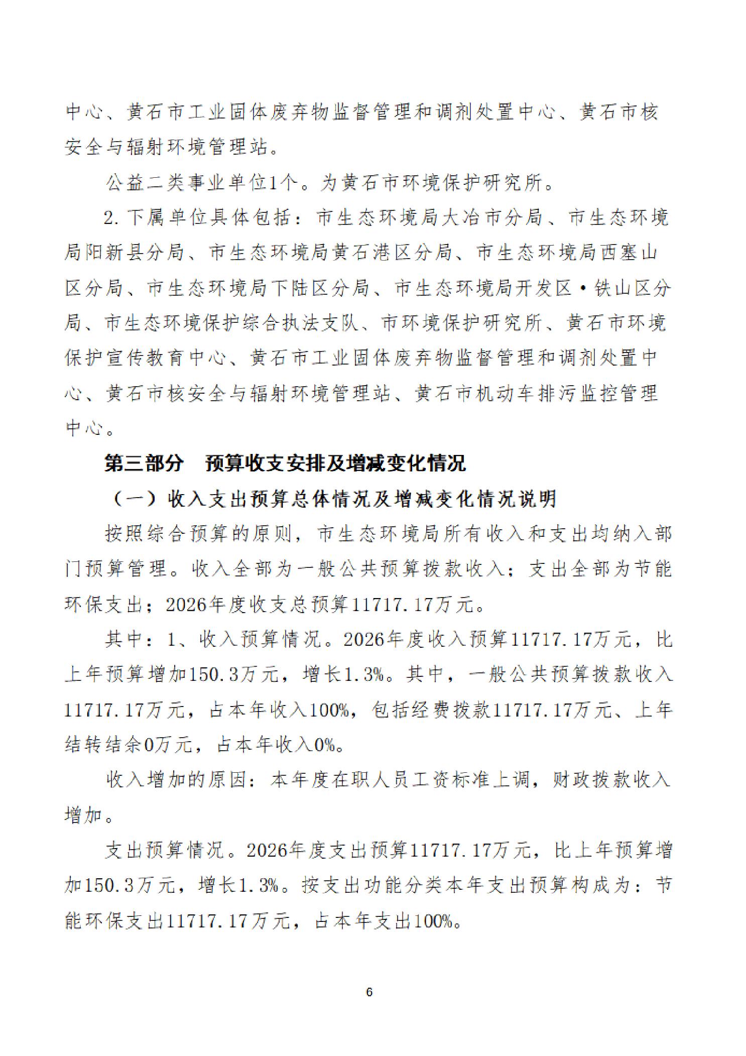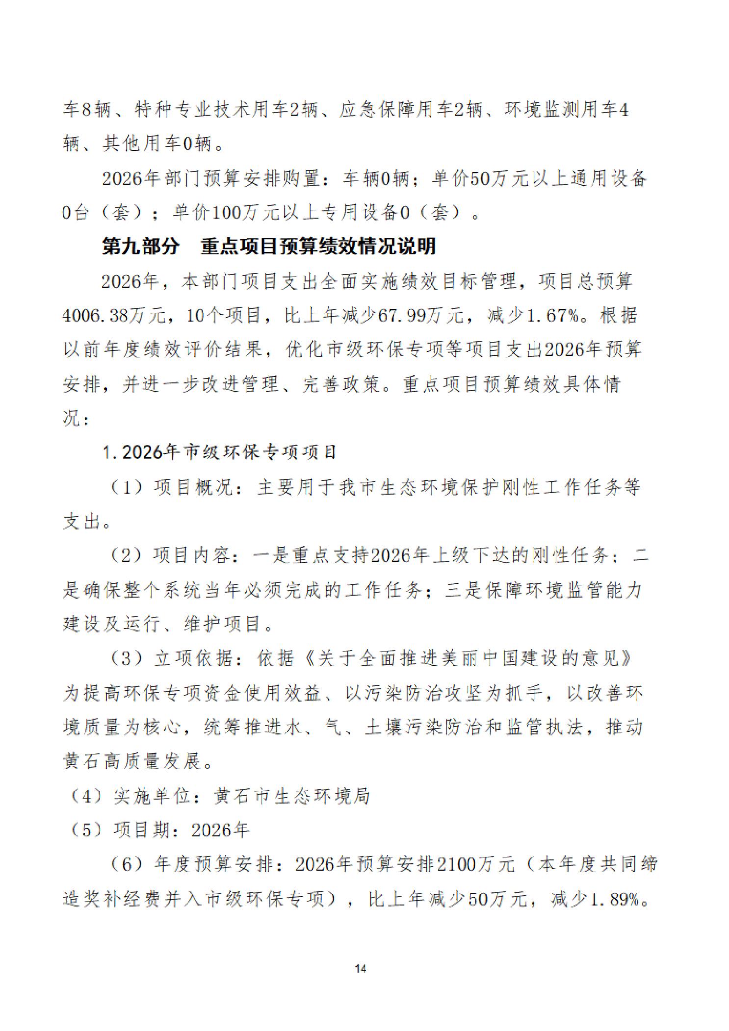2026年度黄石市生态环境局(汇总)部门预算公开情况说明