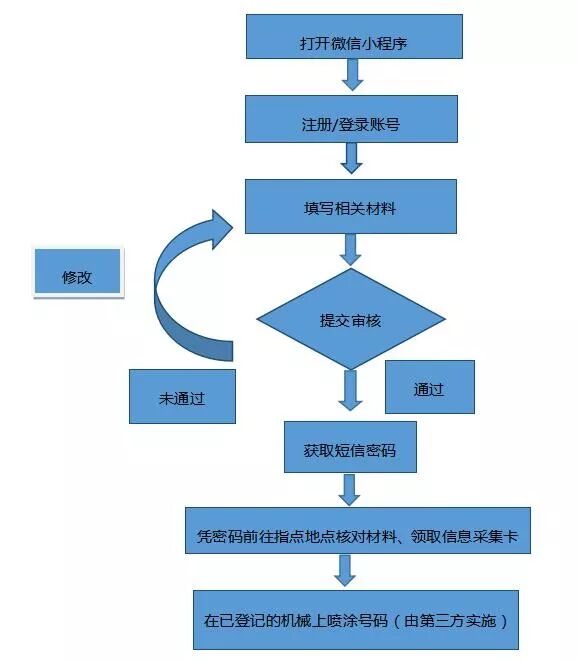 三、办理方式。非道路移动机械所有人(单位), 可通过微信小程序“非道路移动机械环保信息采集”进行申报(具体操作流程可在市生态环境局官网查询),也可到各县(市、区)受理点办理。生态环境部门对申报信息审核后,通知机械所有人(单位)领取信息采集卡、喷涂环保标识牌。本次非道路移动机械摸底调查和编码登记不收取任何费用。