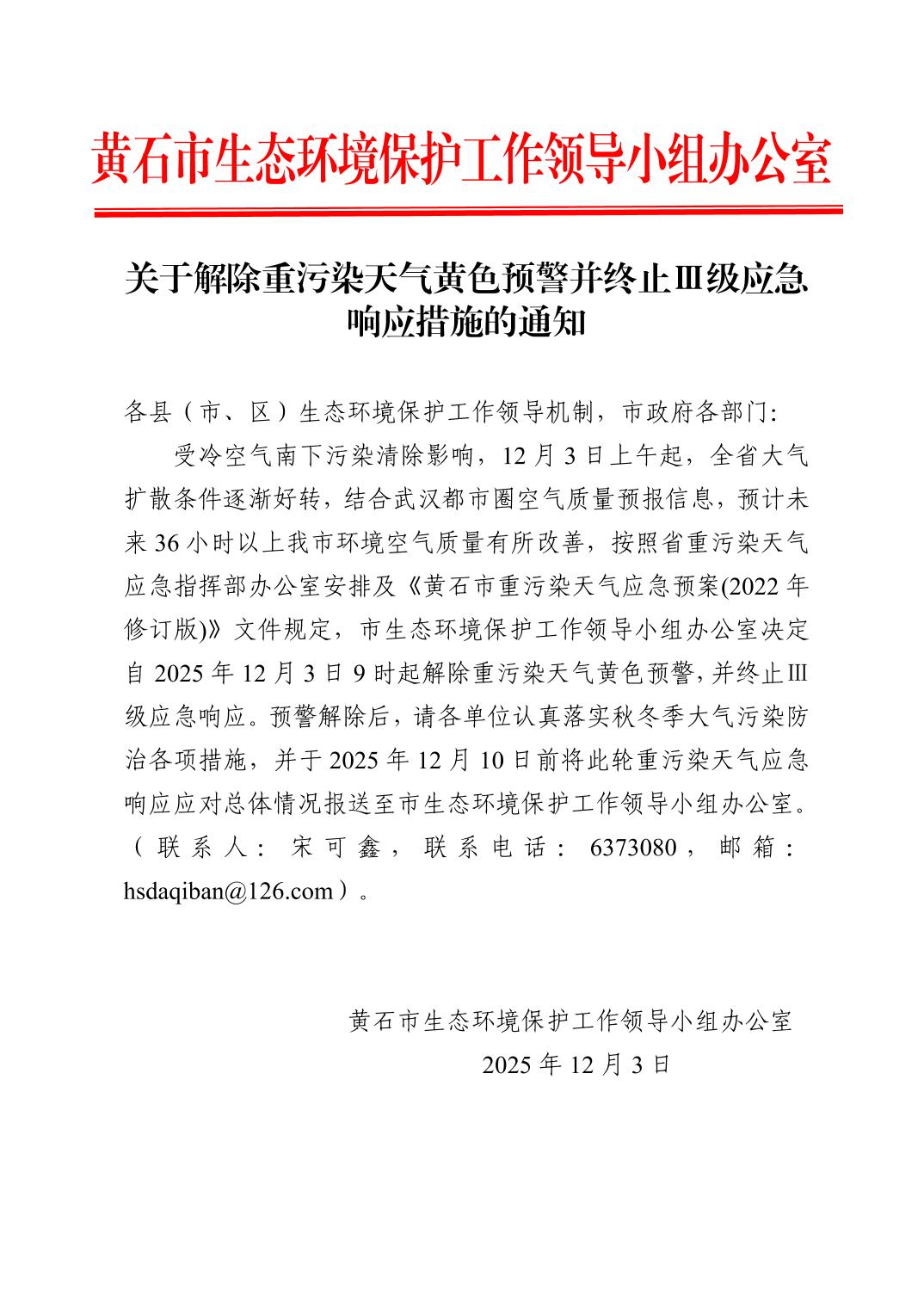 关于解除重污染天气黄色预警并终止Ⅲ级应急响应措施的通知