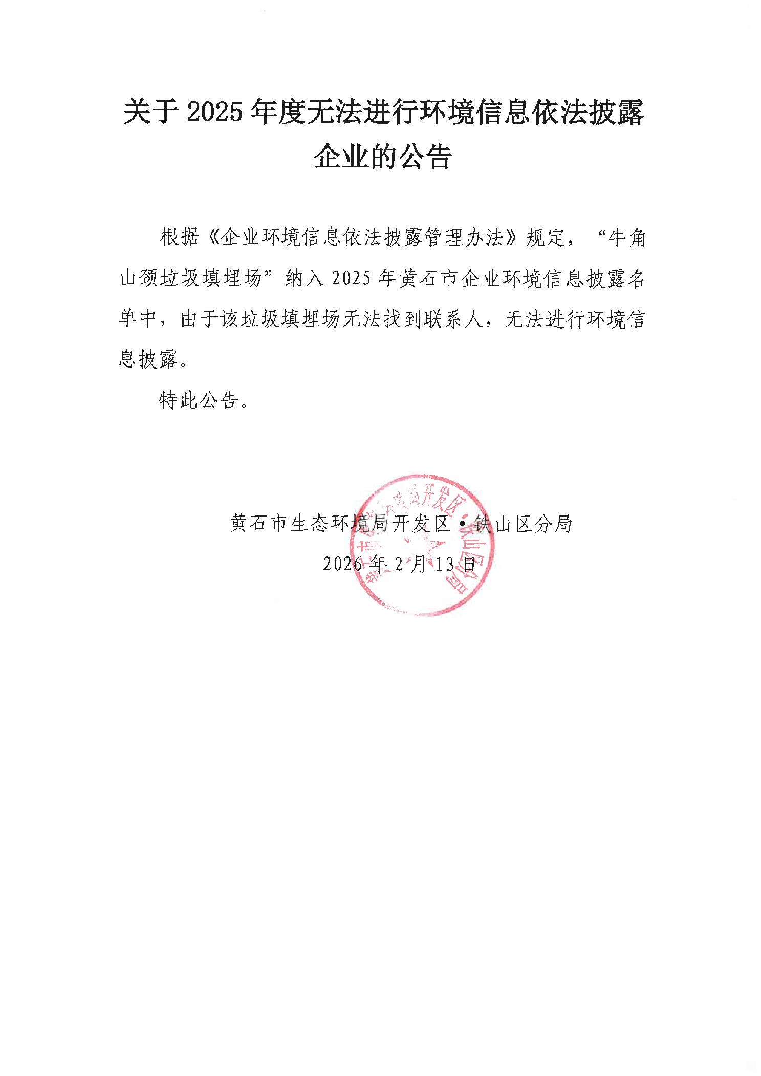 关于2025年度无法进行环境信息依法披露企业的公告